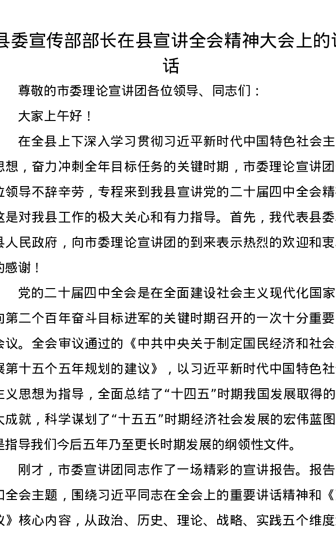 县委宣传部部长在县宣讲全会精神大会上的讲话