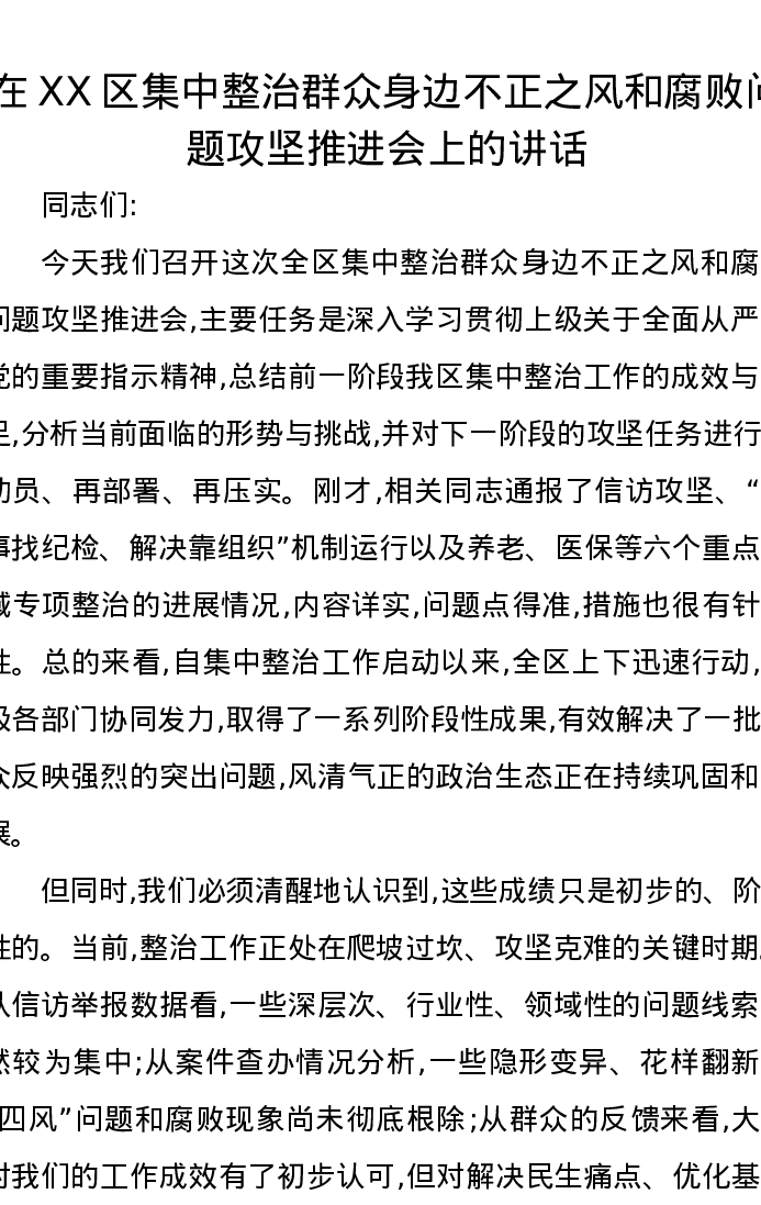 在XX区集中整治群众身边不正之风和腐败问题攻坚推进会上的讲话