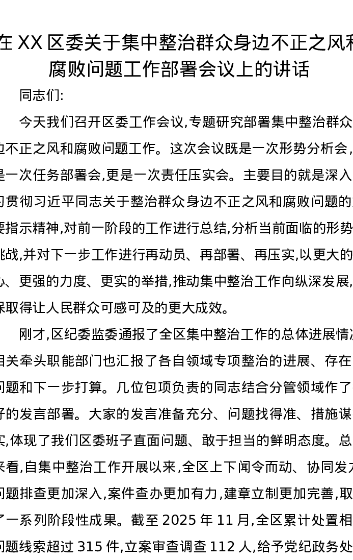 在XX区委关于集中整治群众身边不正之风和腐败问题工作部署会议上的讲话