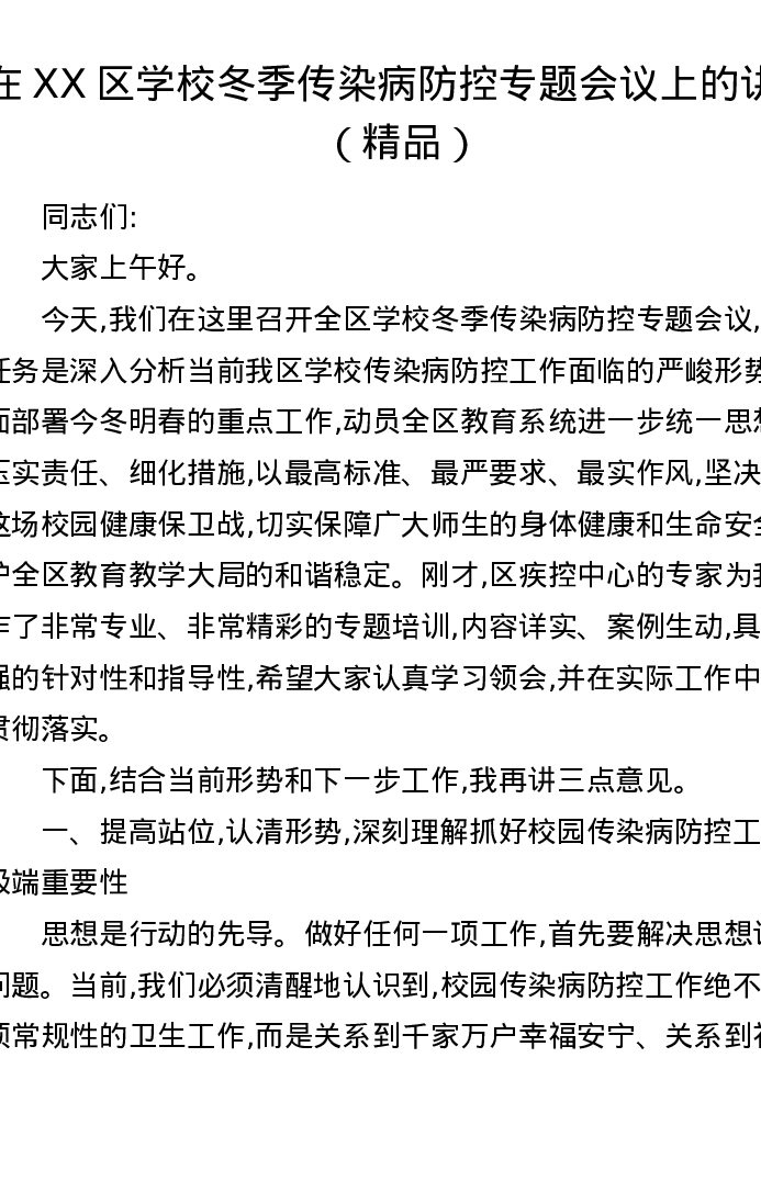 在XX区学校冬季传染病防控专题会议上的讲话