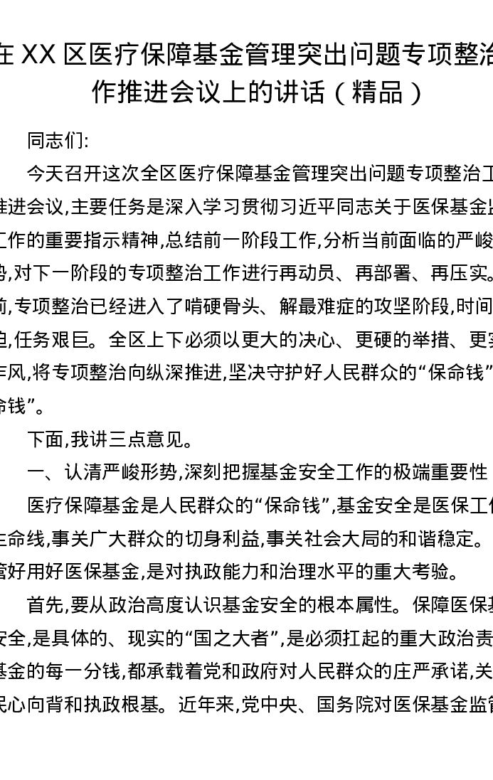 在XX区医疗保障基金管理突出问题专项整治工作推进会议上的讲话