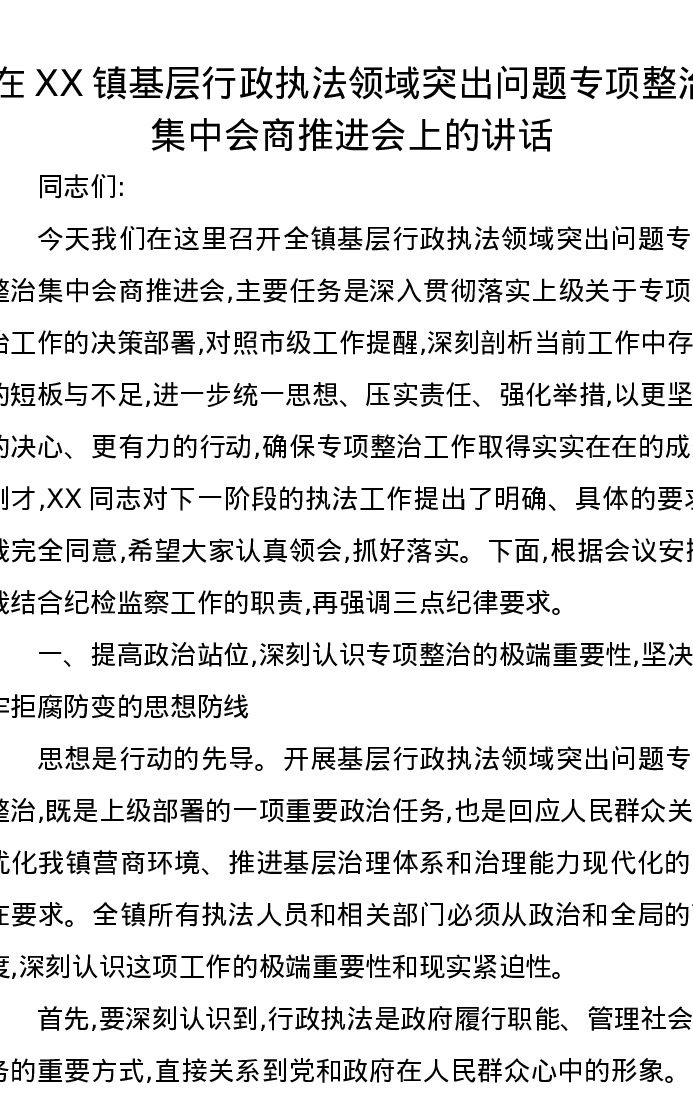 在XX镇基层行政执法领域突出问题专项整治集中会商推进会上的讲话
