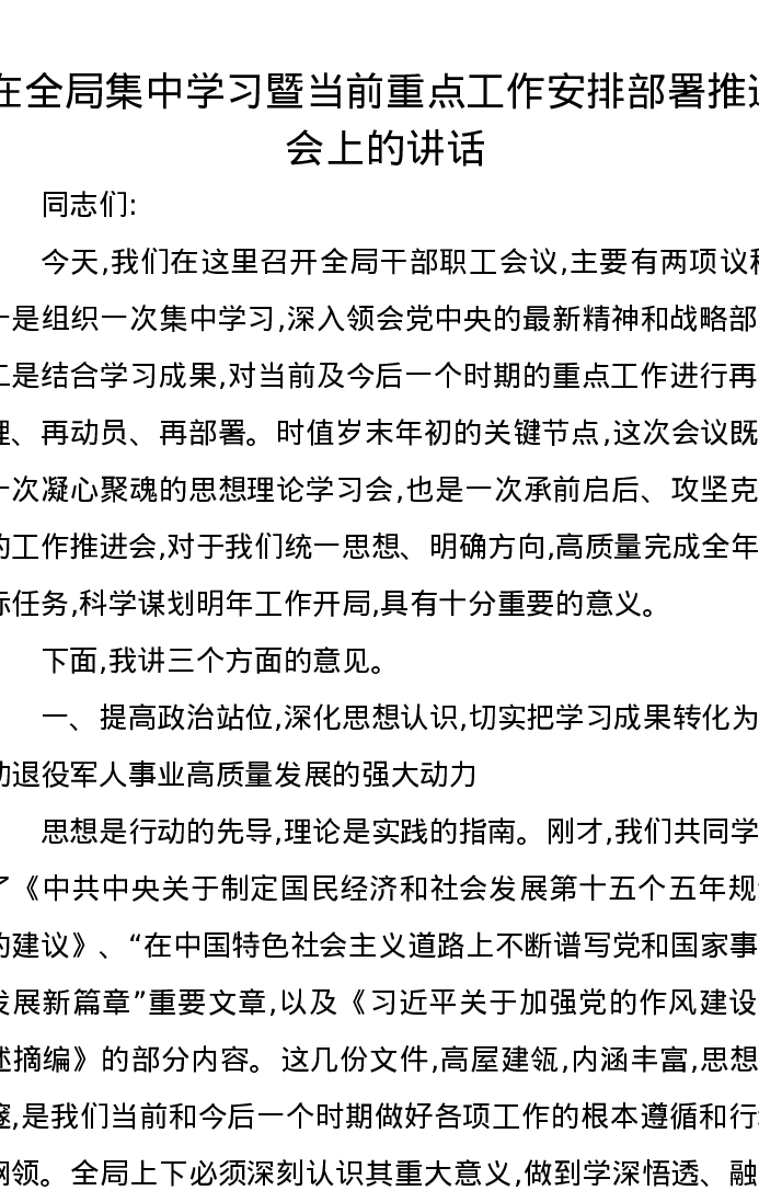在全局集中学习暨当前重点工作安排部署推进会上的讲话