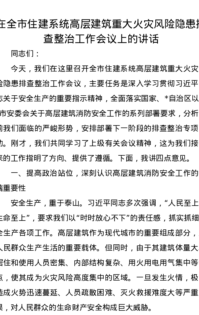 在全市住建系统高层建筑重大火灾风险隐患排查整治工作会议上的讲话