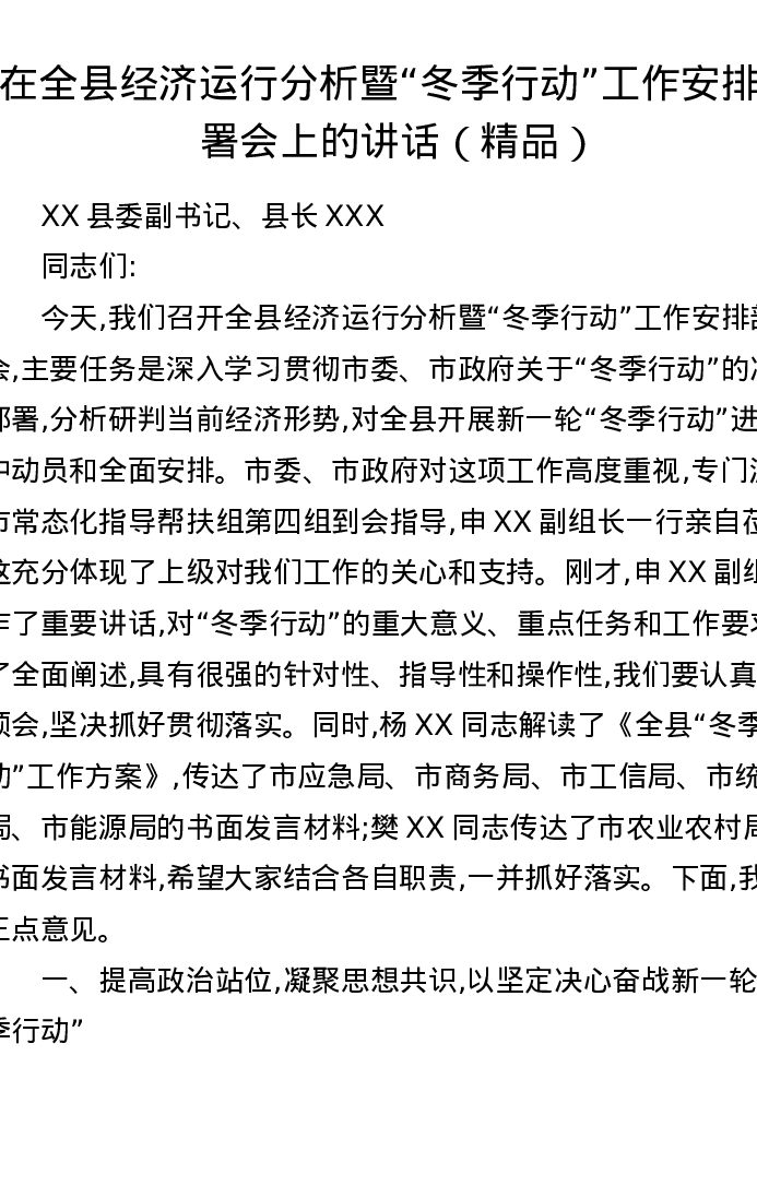 在全县经济运行分析暨“冬季行动”工作安排部署会上的讲话