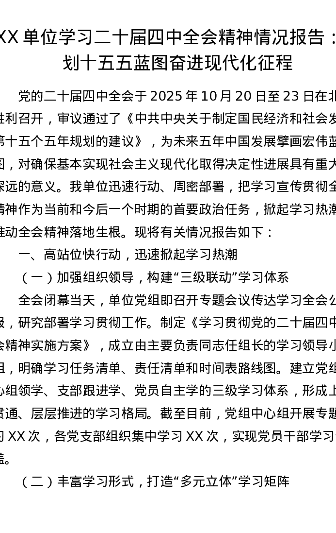 XX单位学习二十届四中全会精神情况报告:谋划十五五蓝图 奋进现代化征程