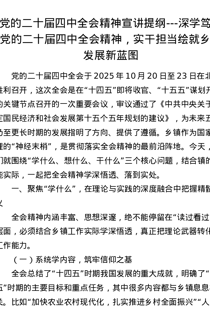 党的二十届四中全会精神宣讲提纲---深学笃行党的二十届四中全会精神,实干担当绘就乡镇发展新蓝图