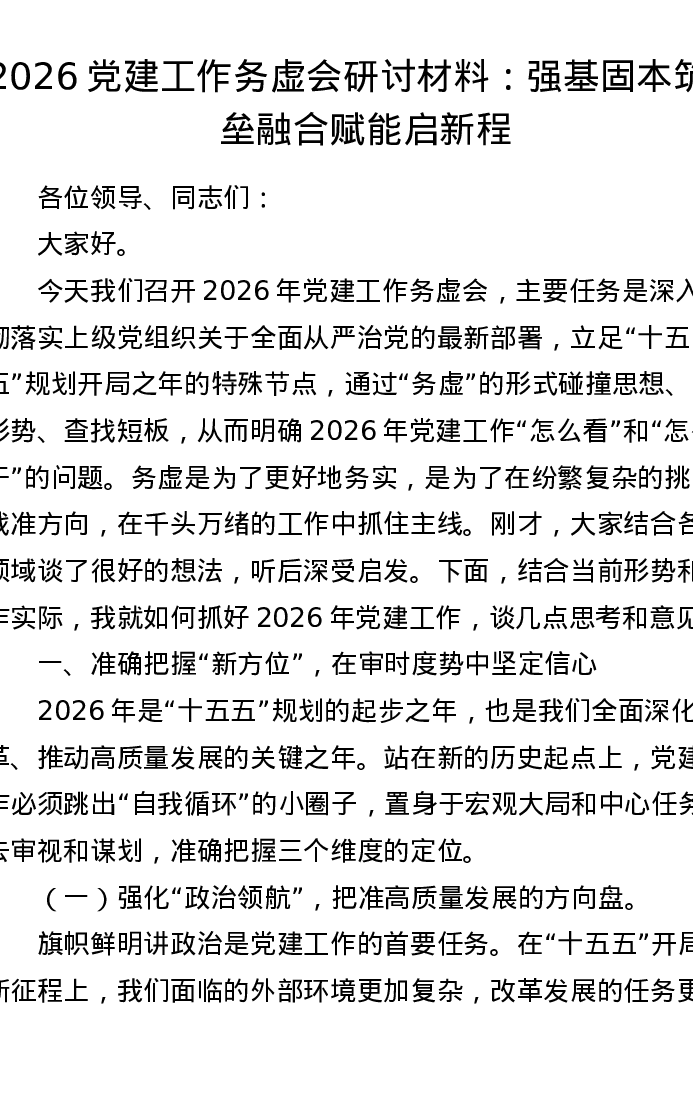 2026党建工作务虚会研讨发言材料:强基固本筑堡垒 融合赋能启新程