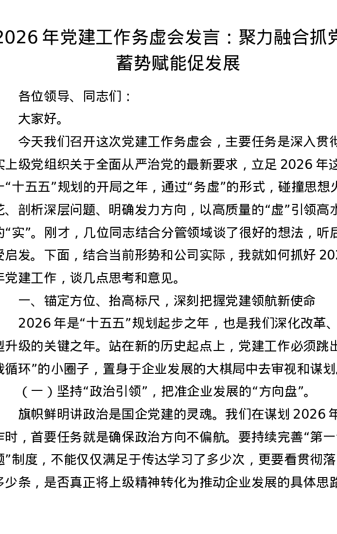2026年党建工作务虚会发言:聚力融合抓党建 蓄势赋能促发展