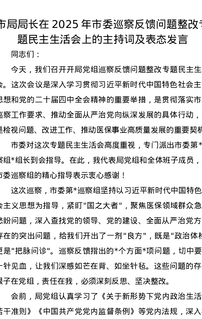 市局局长在2025年市委巡察反馈问题整改专题xxxxx上的主持词及表态发言