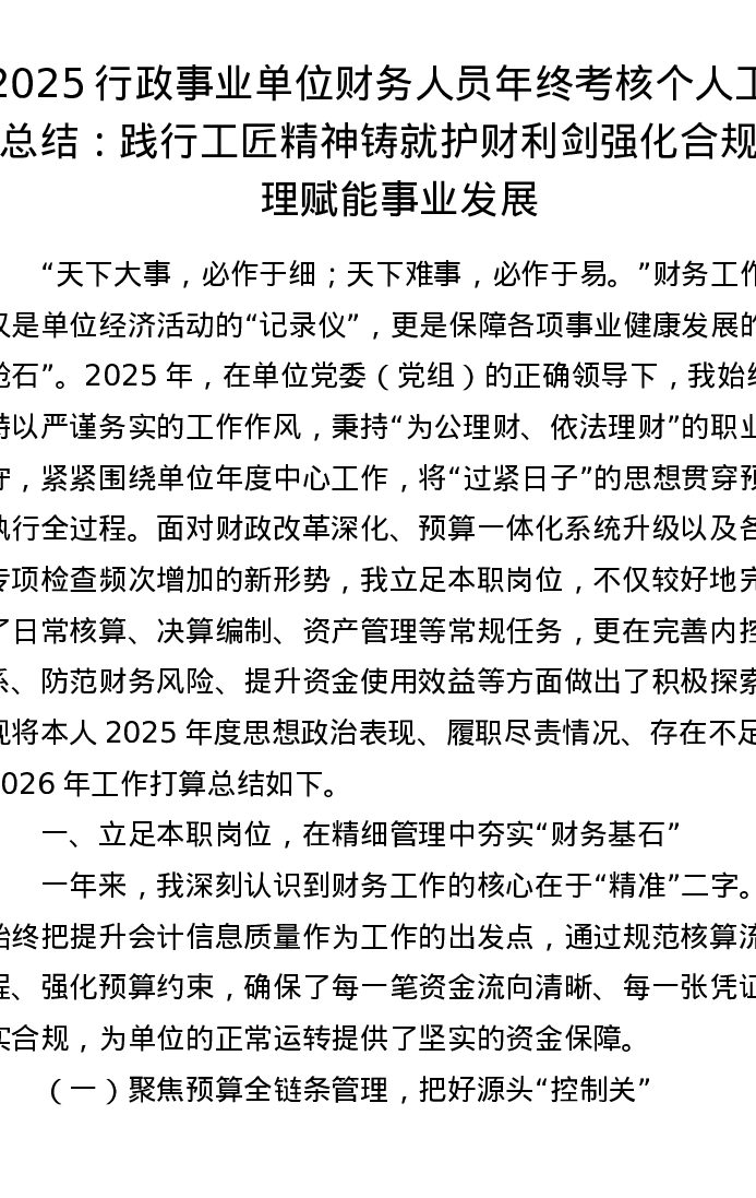 2025行政事业单位财务人员年终考核个人工作总结:践行工匠精神铸就护财利剑 强化合规管理赋能事业发展