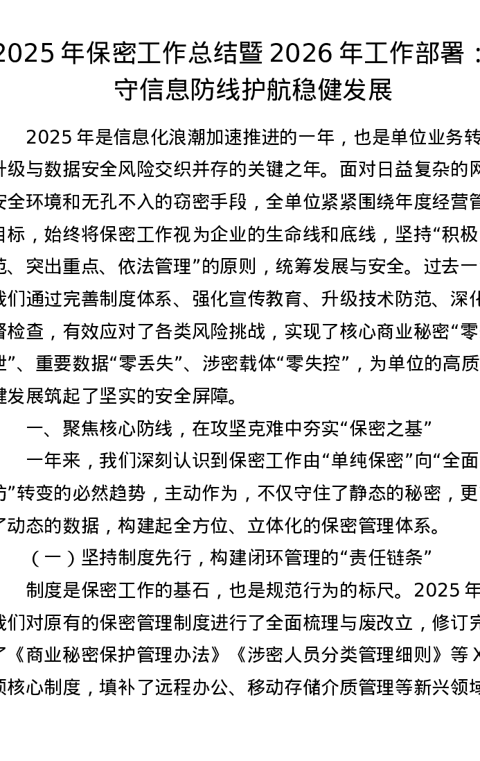 2025年保密工作总结暨2026年工作部署:严守信息防线 护航稳健发展
