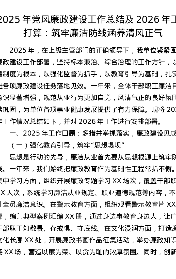 2025年党风廉政建设工作总结及2026年工作打算:筑牢廉洁防线 涵养清风正气