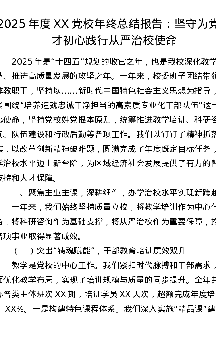 2025年度XX党校年终总结报告:坚守为党育才初心 践行从严治校使命