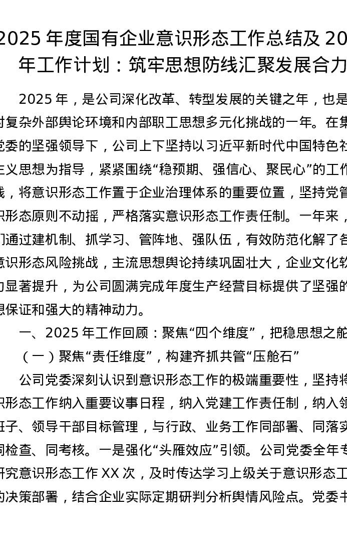 2025年度国有企业意识形态工作总结及2026年工作计划:筑牢思想防线 汇聚发展合力