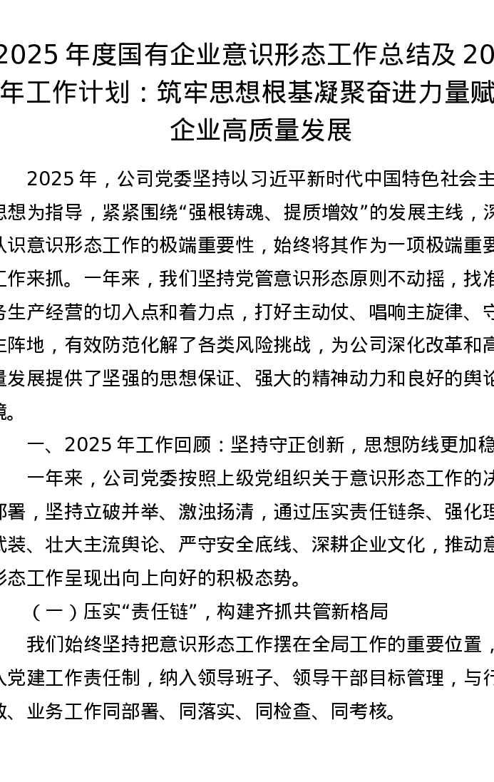 2025年度国有企业意识形态工作总结及2026年工作计划:筑牢思想根基凝聚奋进力量 赋能企业高质量发展