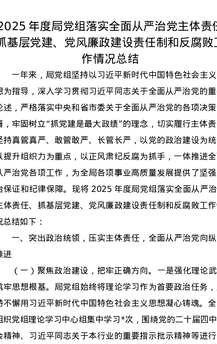 2025年度局党组落实全面从严治党主体责任、抓基层党建、党风廉政建设责任制和反腐败工作情况总结