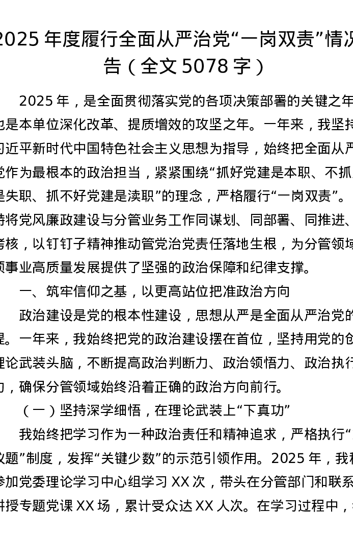 2025年度履行全面从严治党“一岗双责”情况报告(全文5078字)