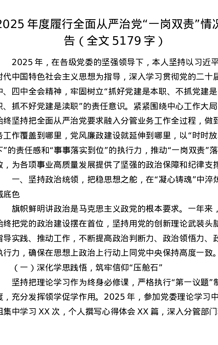2025年度履行全面从严治党“一岗双责”情况报告(全文5179字)