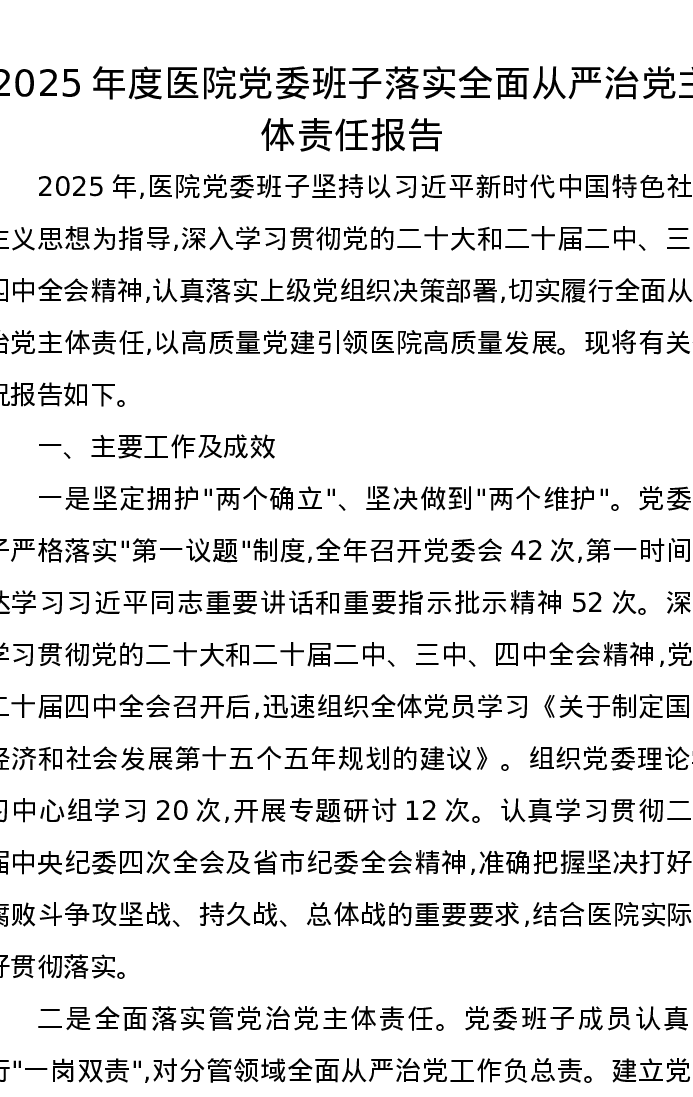 2025年度医院党委班子落实全面从严治党主体责任报告