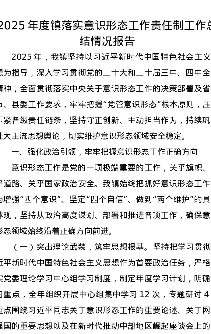 2025年度镇落实意识形态工作责任制工作总结情况报告