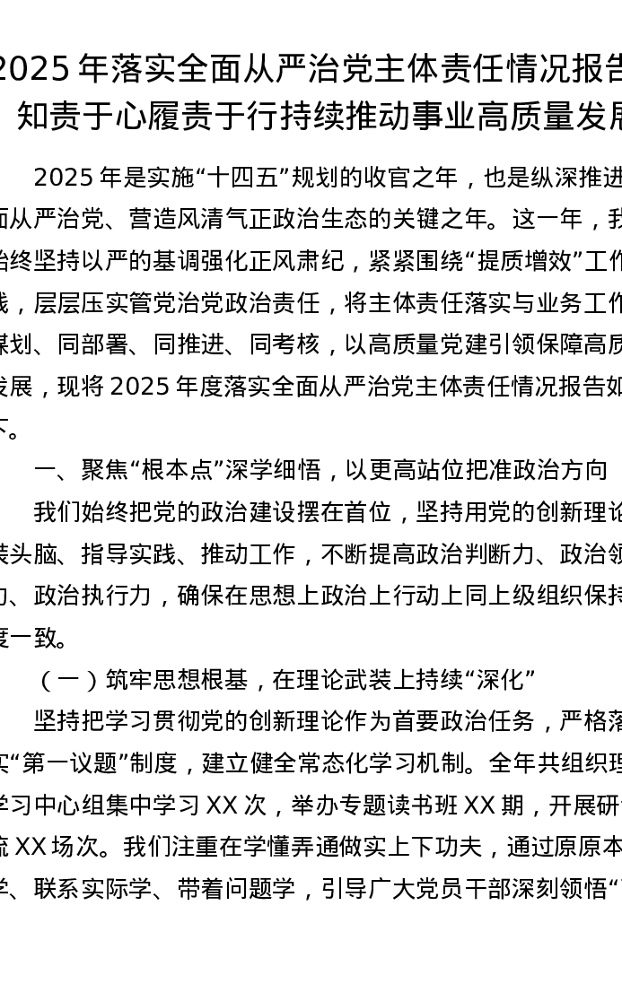 2025年落实全面从严治党主体责任情况报告:知责于心履责于行 持续推动事业高质量发展