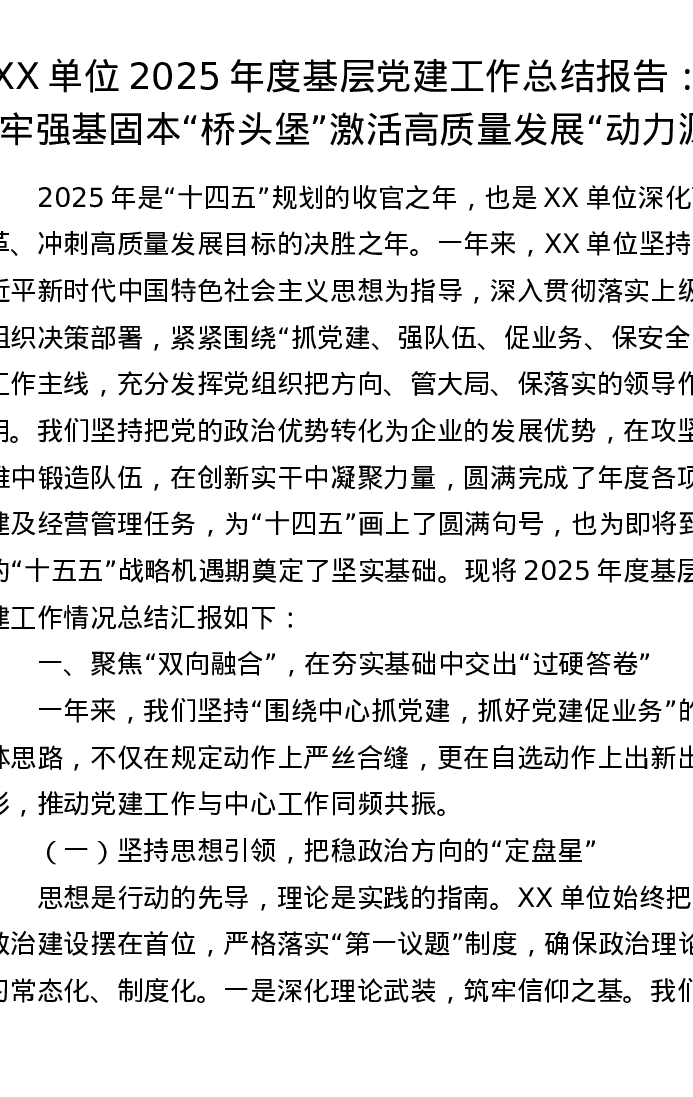 XX单位2025年度基层党建工作总结报告:筑牢强基固本“桥头堡” 激活高质量发展“动力源”