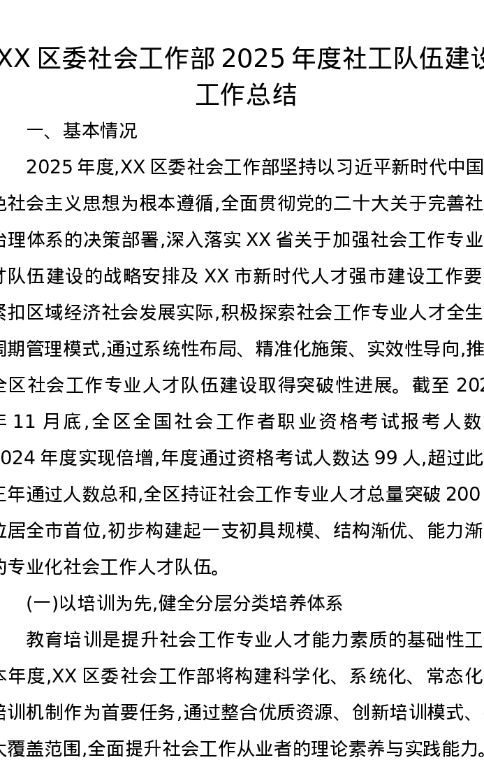 XX区委社会工作部2025年度社工队伍建设工作总结