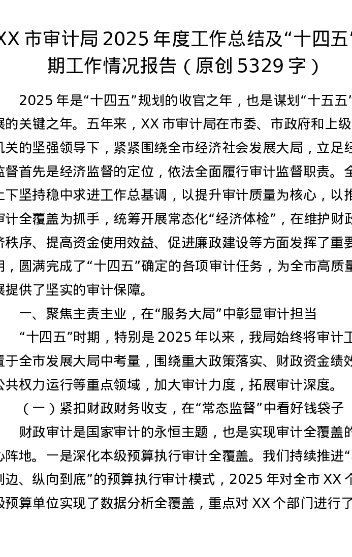 XX市审计局2025年度工作总结及“十四五”时期工作情况报告(5329字)