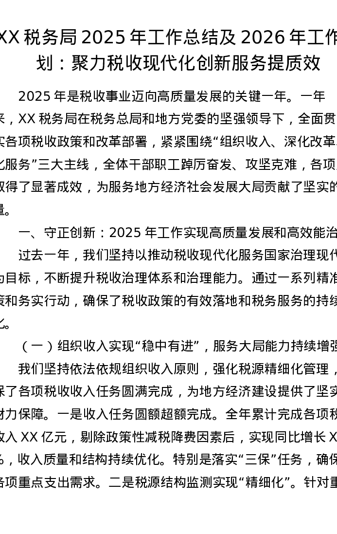 XX税务局2025年工作总结及2026年工作谋划:聚力税收现代化 创新服务提质效