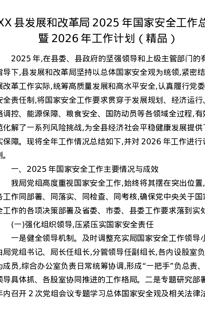 XX县发展和改革局2025年国家安全工作总结暨2026年工作计划