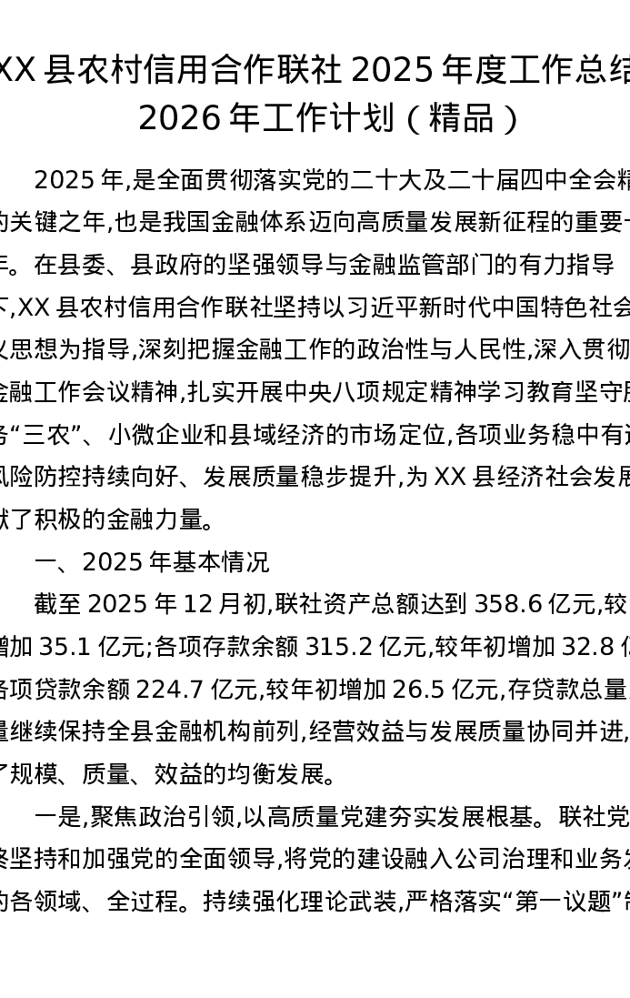 XX县农村信用合作联社2025年度工作总结暨2026年工作计划