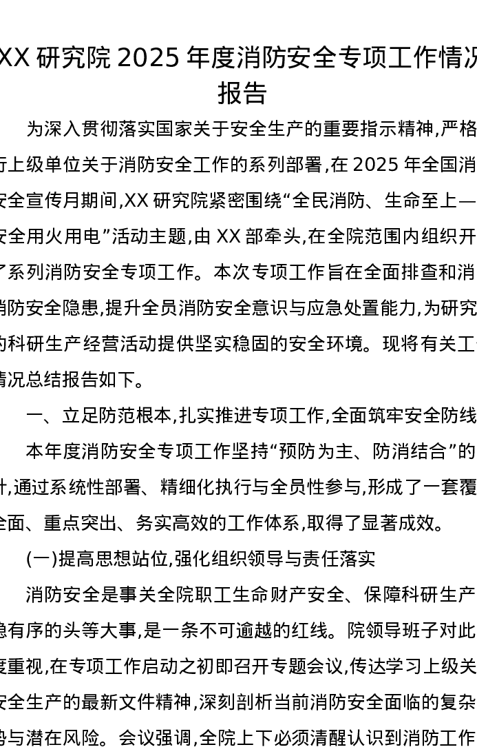 XX研究院2025年度消防安全专项工作情况报告