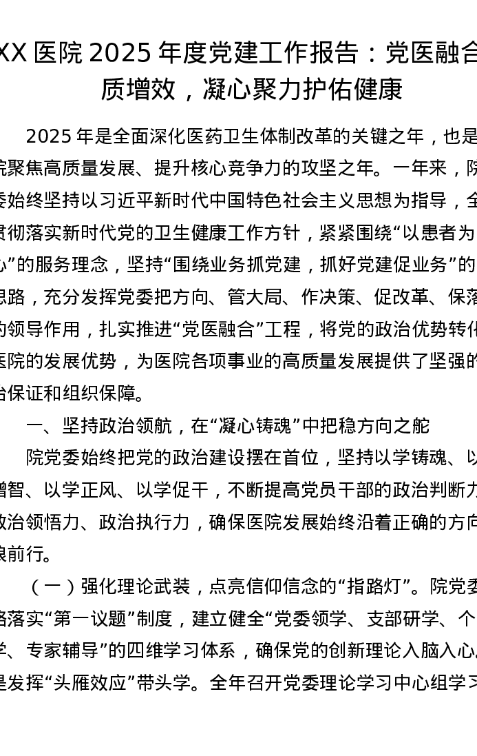 XX医院2025年度党建工作报告:党医融合提质增效,凝心聚力护佑健康