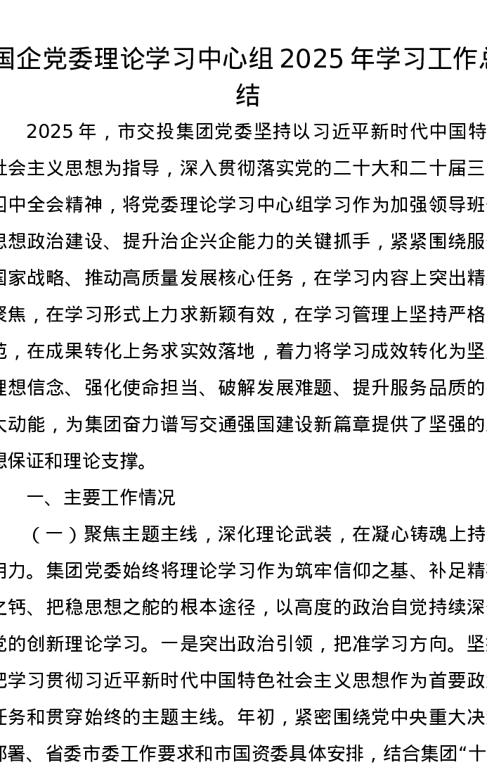 国企党委理论学习中心组2025年学习工作总结