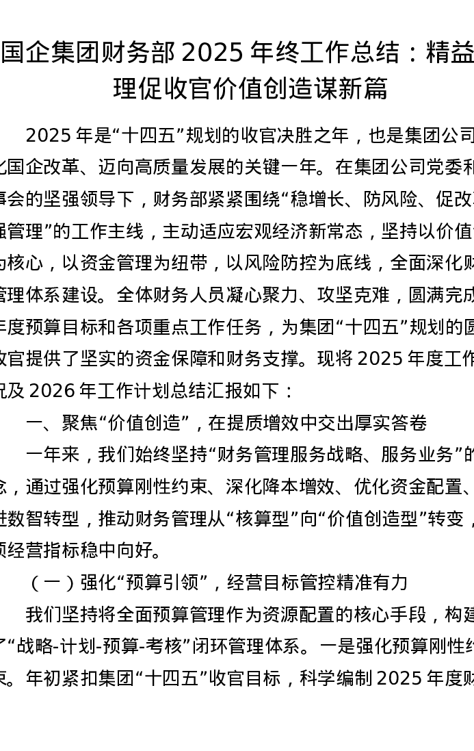 国企集团财务部2025年终工作总结:精益管理促收官 价值创造谋新篇