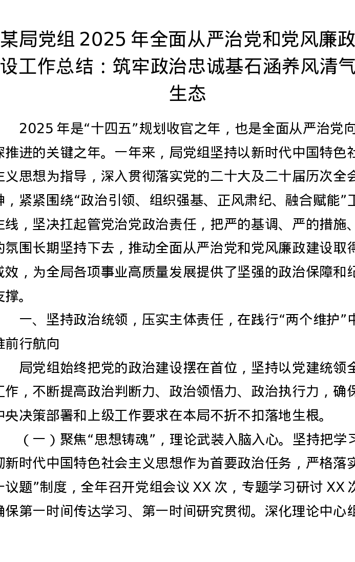 某局党组2025年全面从严治党和党风廉政建设工作总结:筑牢政治忠诚基石 涵养风清气正生态