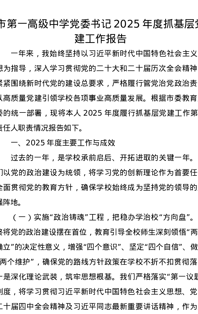 市第一高级中学党委书记2025年度抓基层党建工作报告