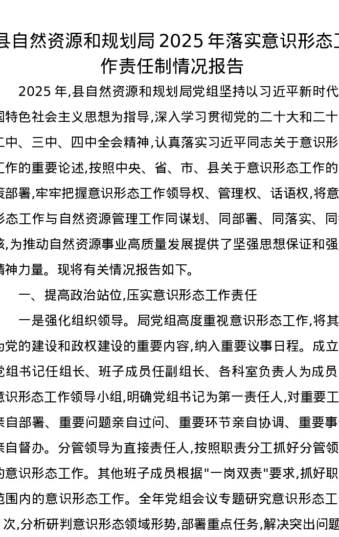 县自然资源和规划局2025年落实意识形态工作责任制情况报告