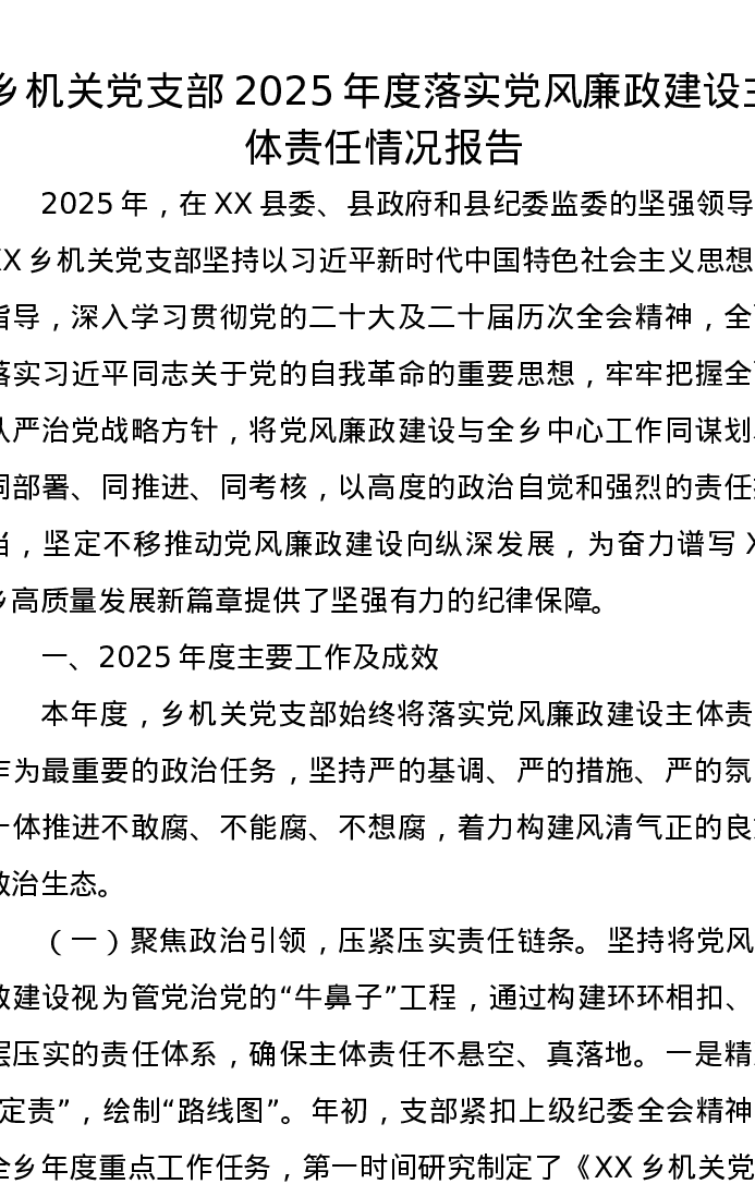 乡机关党支部2025年度落实党风廉政建设主体责任情况报告
