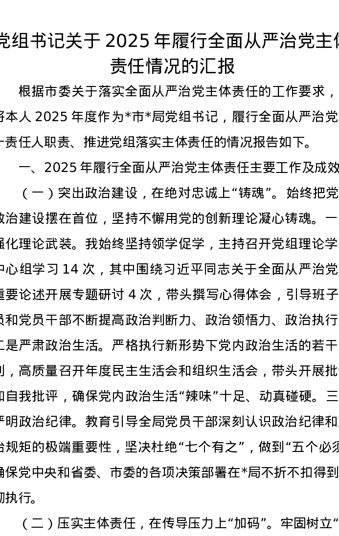 党组书记关于2025年履行全面从严治党主体责任情况的汇报