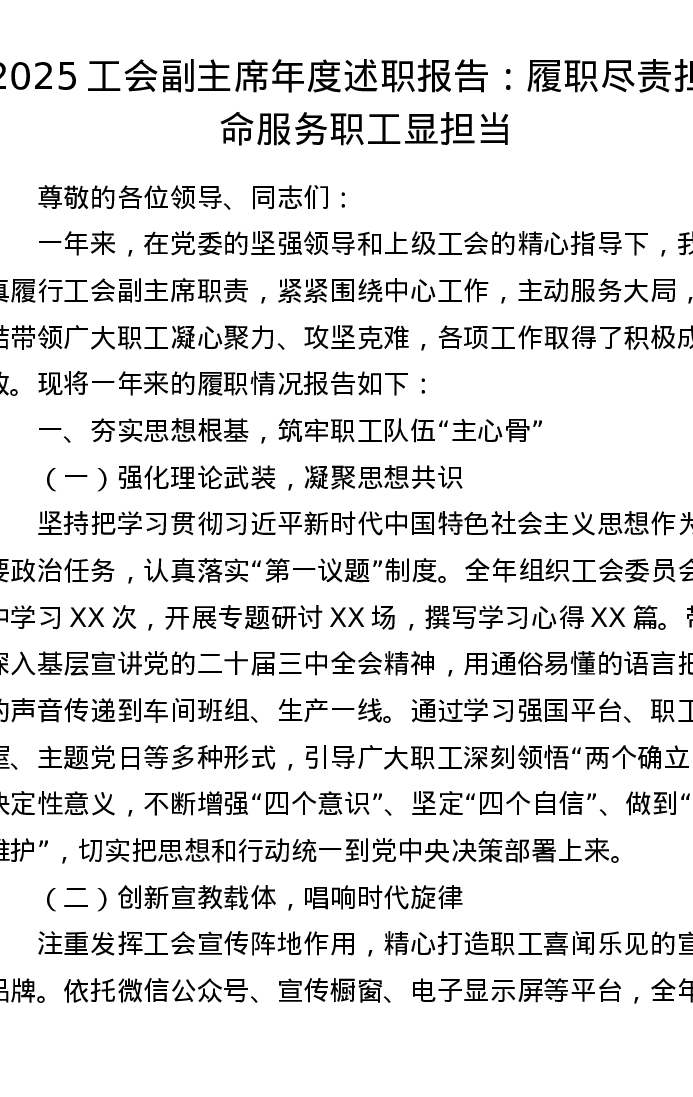 2025工会副主席年度述职报告:履职尽责担使命 服务职工显担当