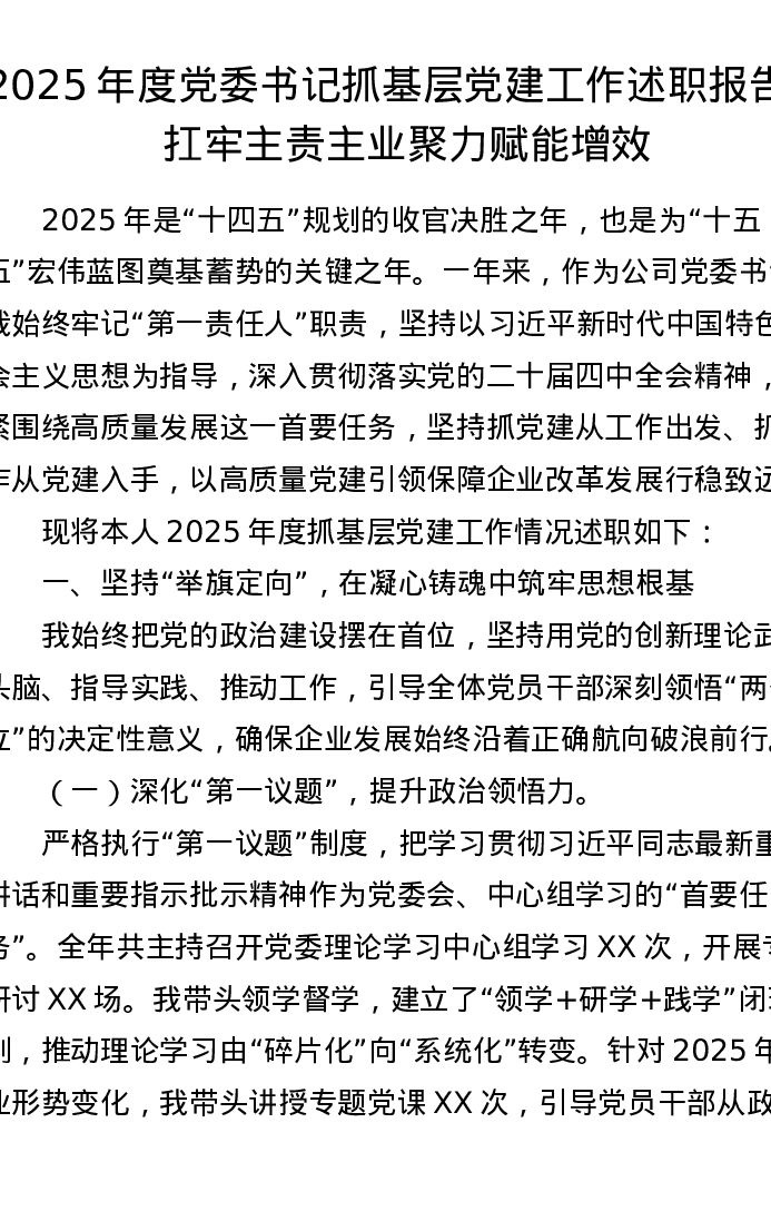 2025年度党委书记抓基层党建工作述职报告:扛牢主责主业 聚力赋能增效