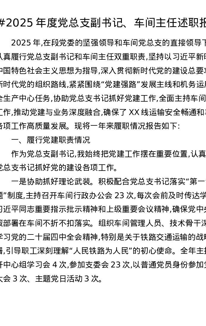 2025年度党总支副书记、车间主任述职报告