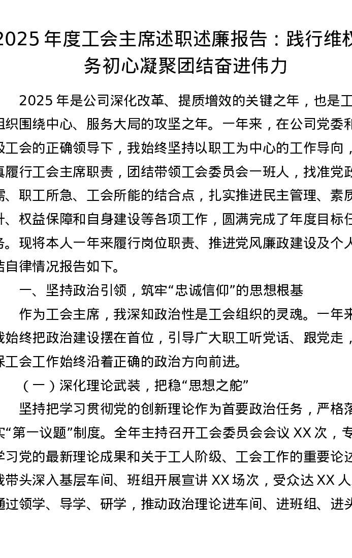 2025年度工会主席述职述廉报告:践行维权服务初心 凝聚团结奋进伟力