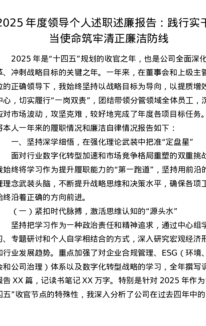 2025年度领导个人述职述廉报告:践行实干担当使命 筑牢清正廉洁防线