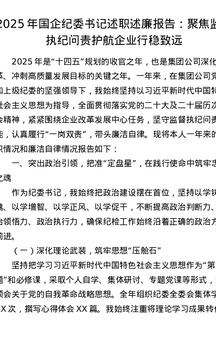 2025年国企纪委书记述职述廉报告:聚焦监督执纪问责 护航企业行稳致远