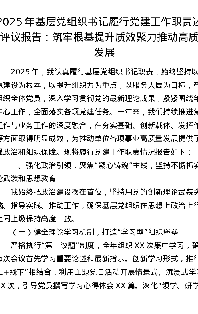 2025年基层党组织书记履行党建工作职责述职评议报告:筑牢根基 提升质效 聚力推动高质量发展
