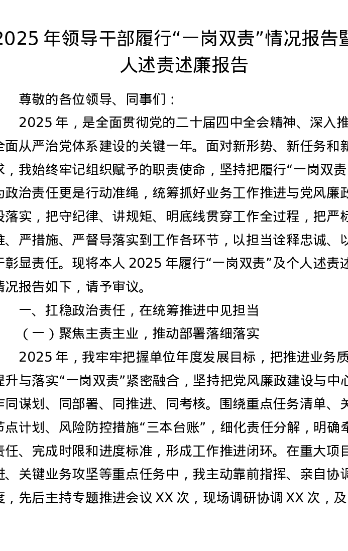 2025年领导干部履行“一岗双责”情况报告暨个人述责述廉报告(3656字)
