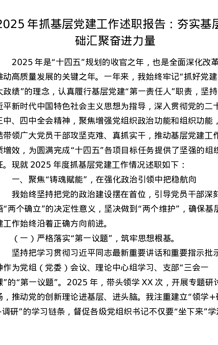 2025年抓基层党建工作述职报告:夯实基层基础 汇聚奋进力量